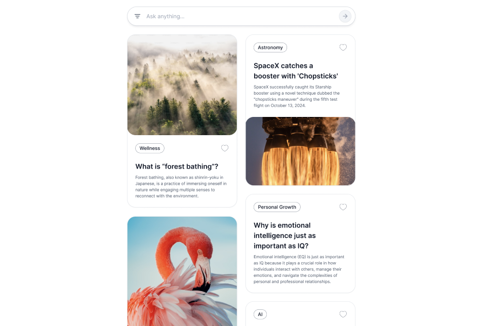 A familiar conversation interface with AI, akin to Perplexity.ai, providing answers in card-like containers.